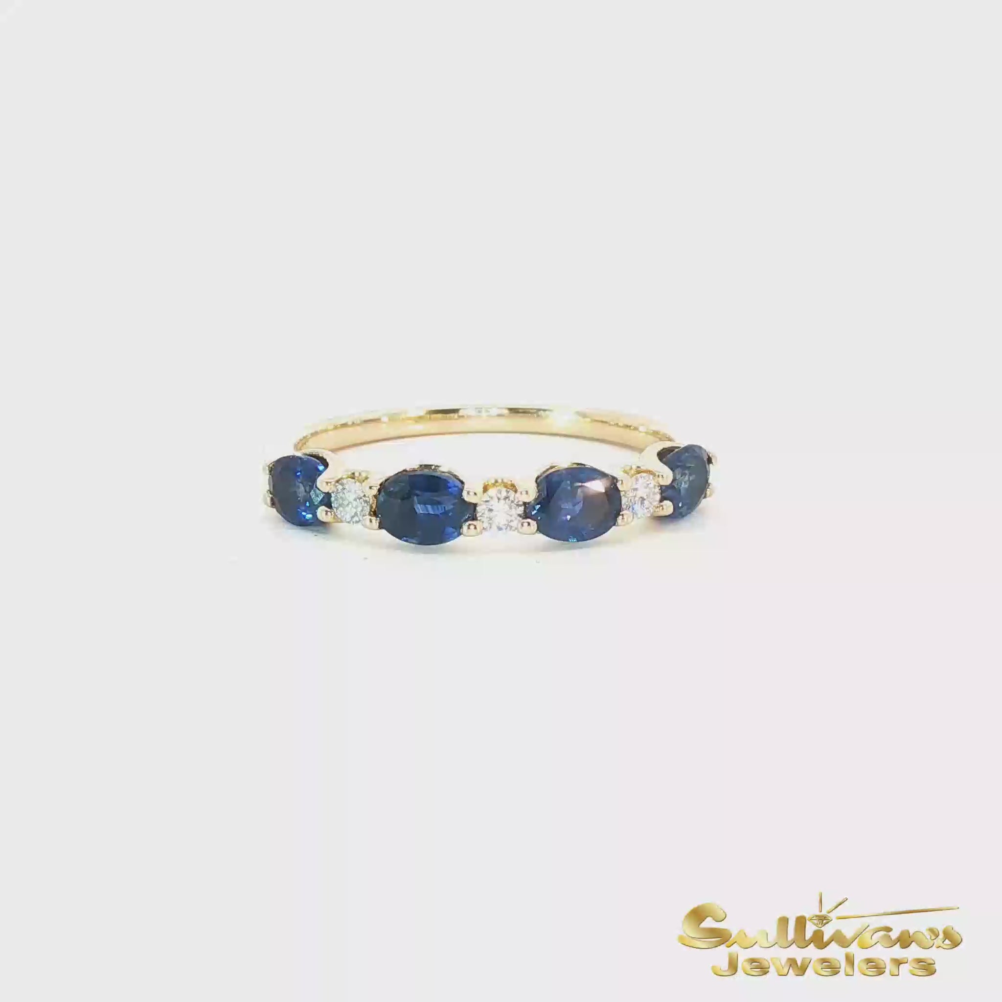 Elevate your style with this captivating sapphire and diamond ring, expertly crafted in warm 14k yellow gold. Showcasing deep blue, four oval sapphires, this ring exudes sophistication. Each gemstone is carefully selected for its clarity and arranged for optimal light dispersion. A testament to timeless design and refined elegance.  Size 6.25