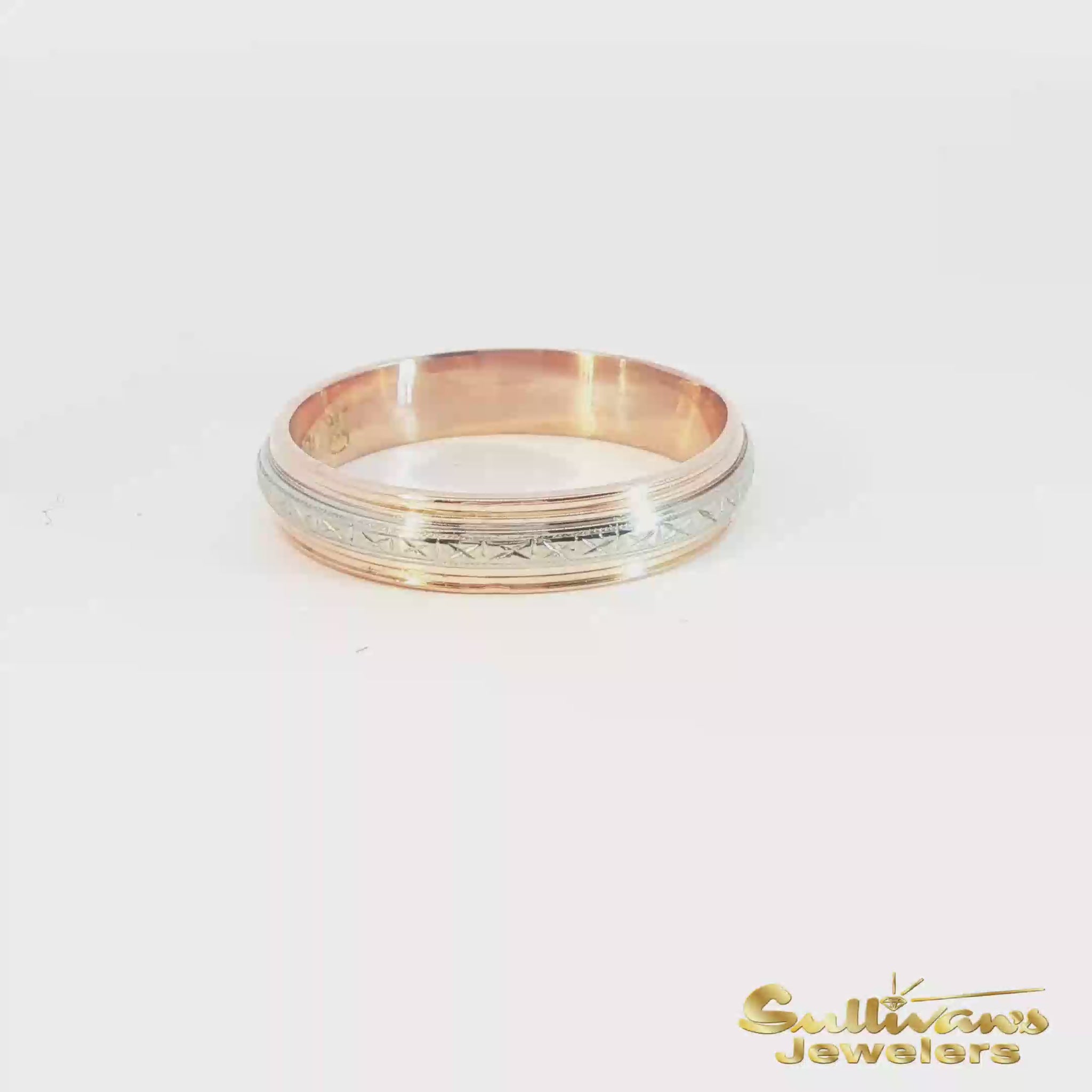 Bound by harmony and detail, this 14k Rose and White gold band unites two precious metals in perfect balance. Warm rose gold borders embrace a luminous white gold center, where delicate X engravings symbolize love, connection, and unity. A beautiful ring for life's most meaningful moments, it shines with elegance and enduring charm.