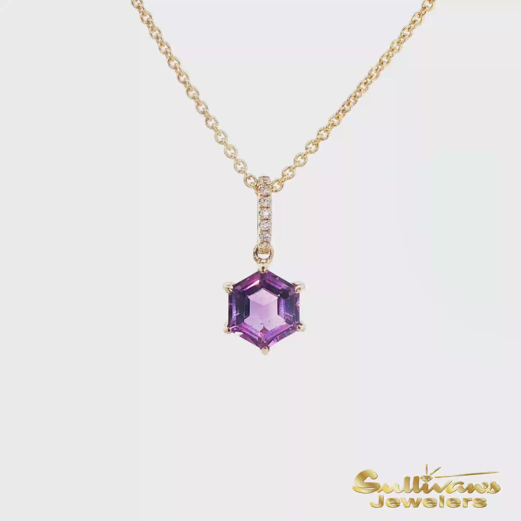 Unique Hexagon shaped Amethyst set in a 14K yellow gold mounting with diamond accents on the bail.  Classy setting, perfect for stacking multiple necklaces together or lovely by itself.